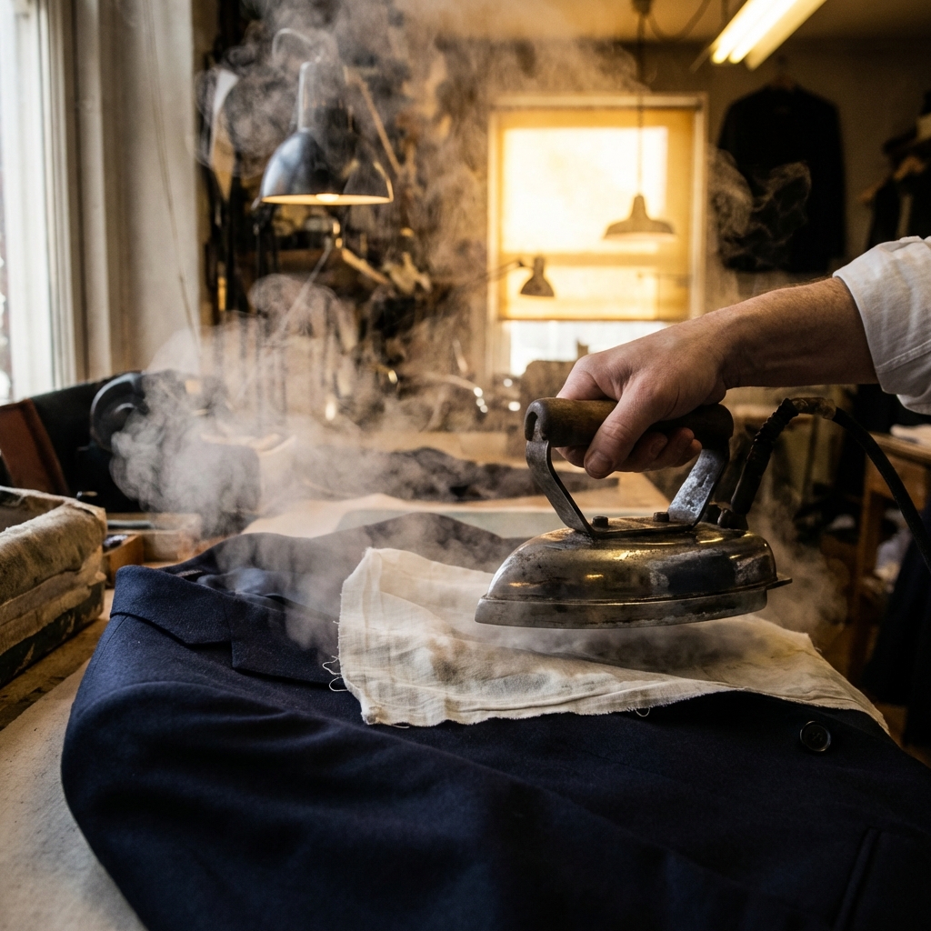 La restauración final. Mediante vapor y planchado profesional, asentamos las costuras y devolvemos la vida a las fibras, entregándole una prenda que luce y se siente como nueva.